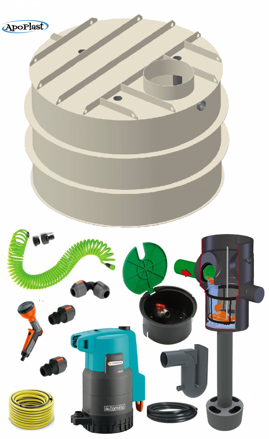 Sestava je vybavena automatickým ponorným čerpadlem Gardena 4700 inox, které zajišťuje pohodlný odběr vody pro zálivku zahrady. Filtrační koš, klidný nátok a přepadový sifon zajišťují čistotu vody a stabilní fungování celého systému.